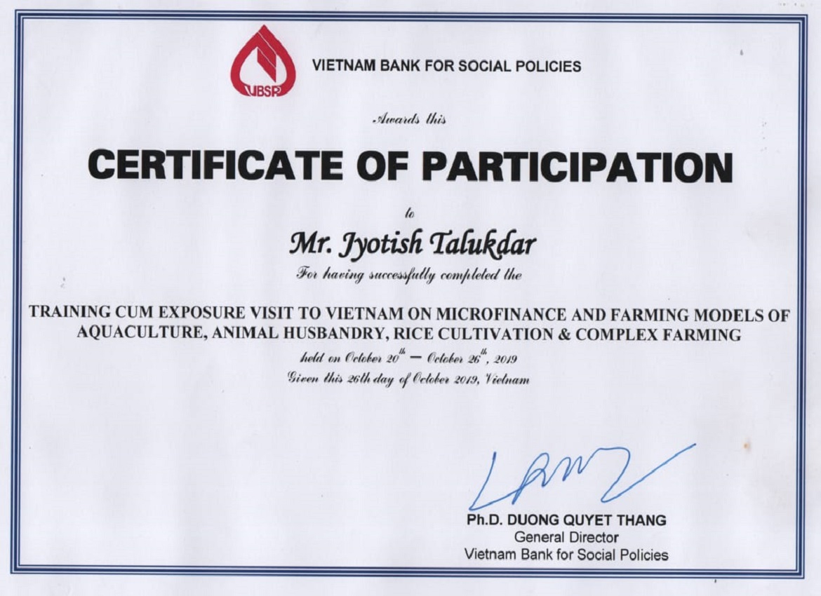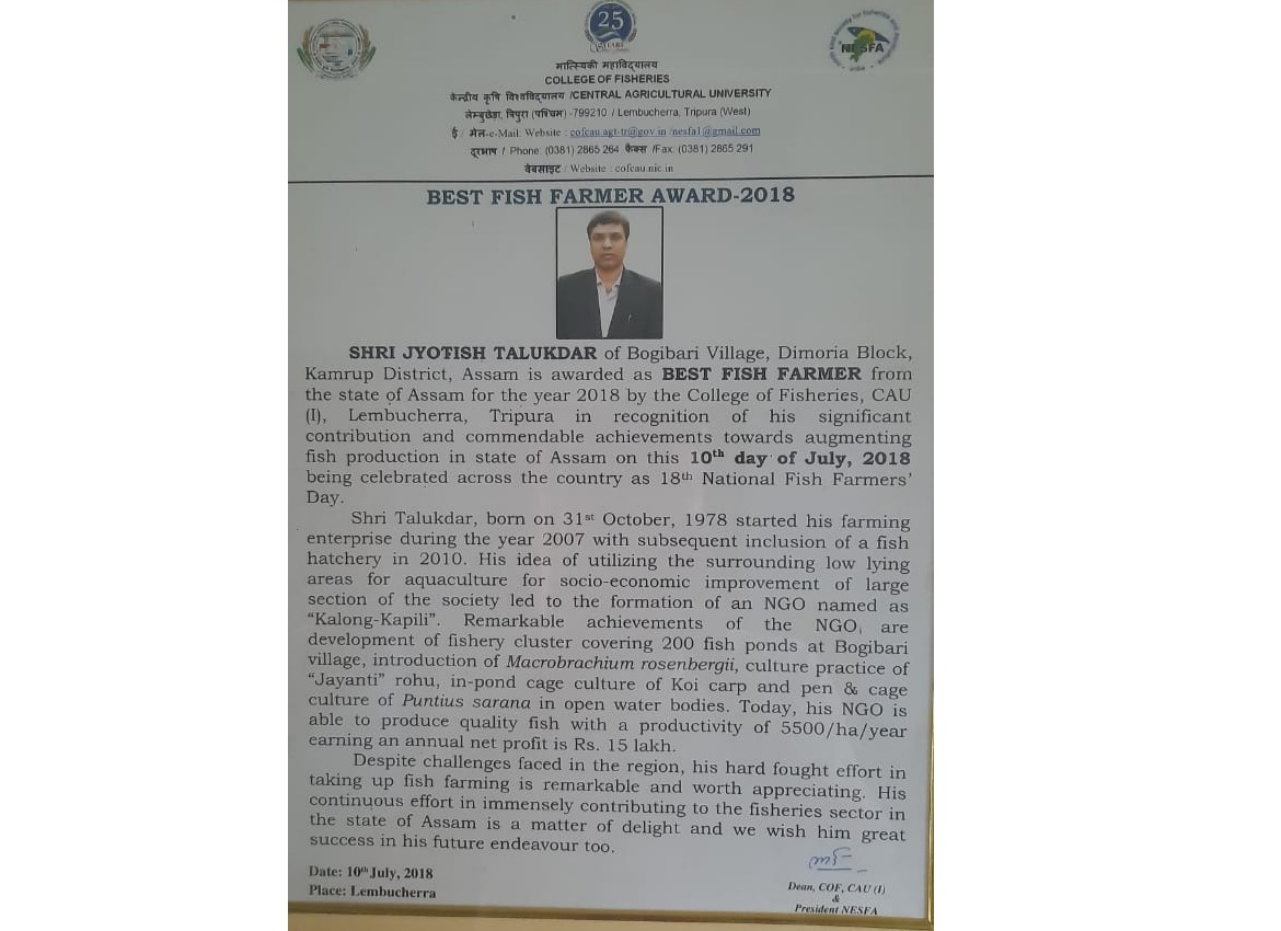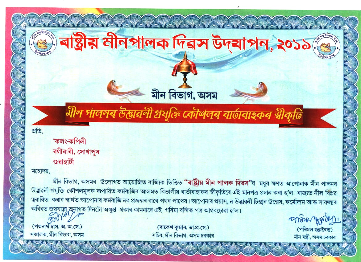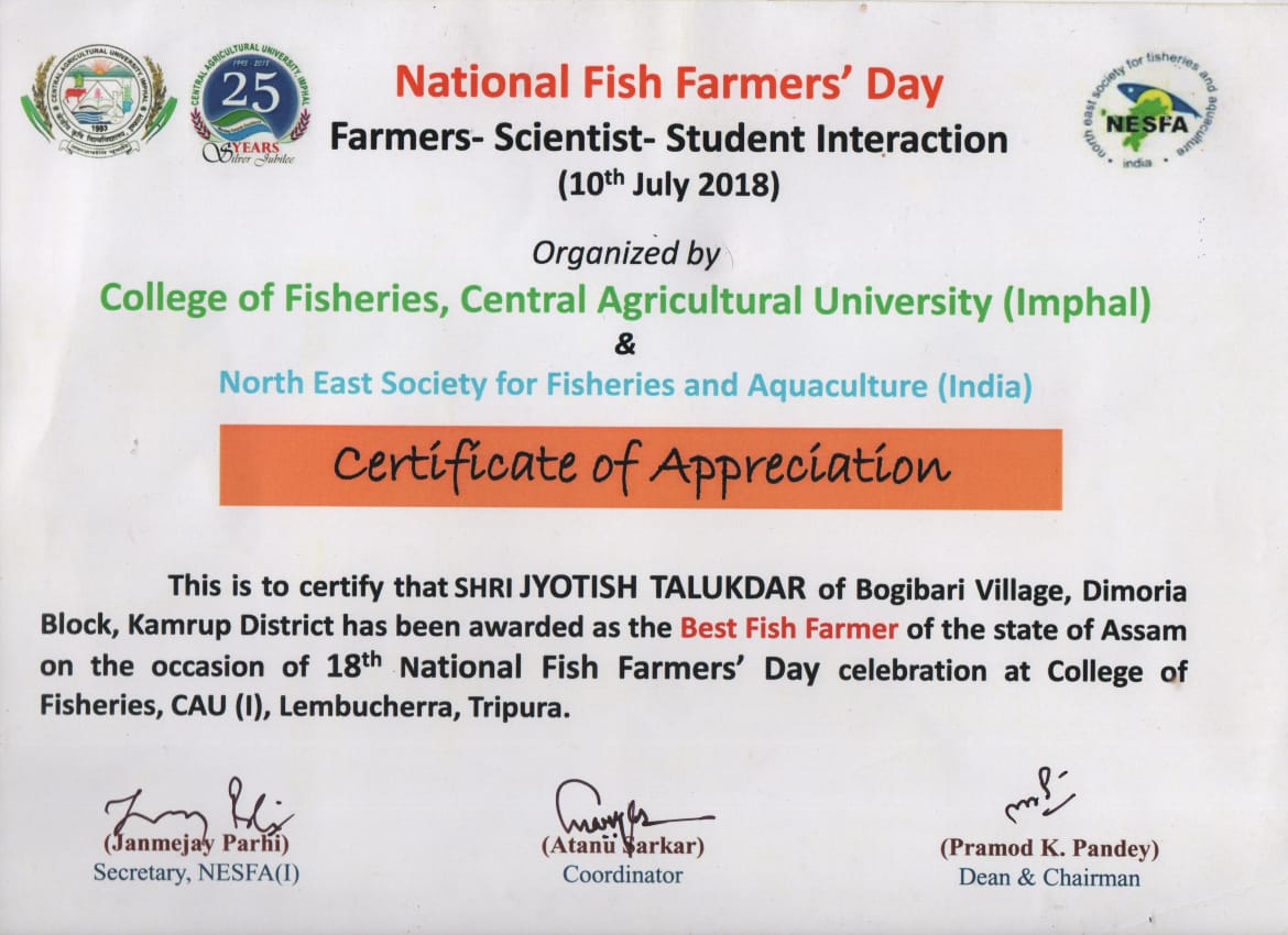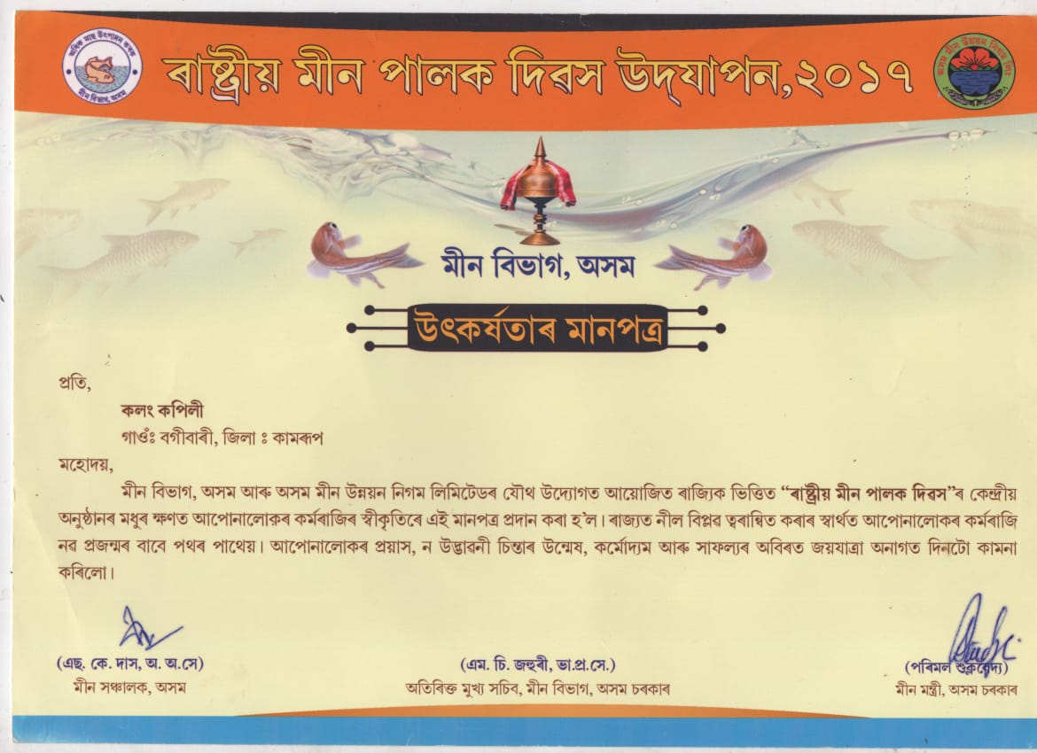 - Certificate of Appreciation presented from Bharatiya Kisan Sangh Assam, India for encouraging and motivating farmers to adopt fish farming.