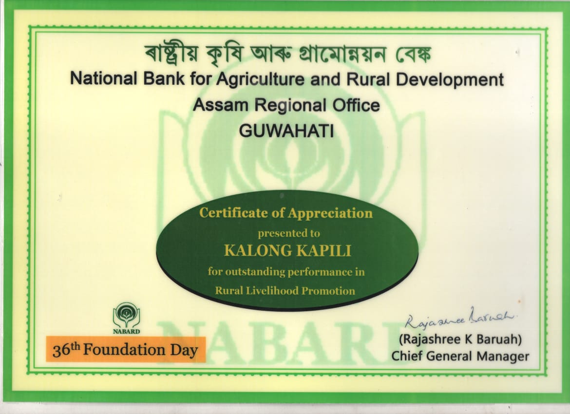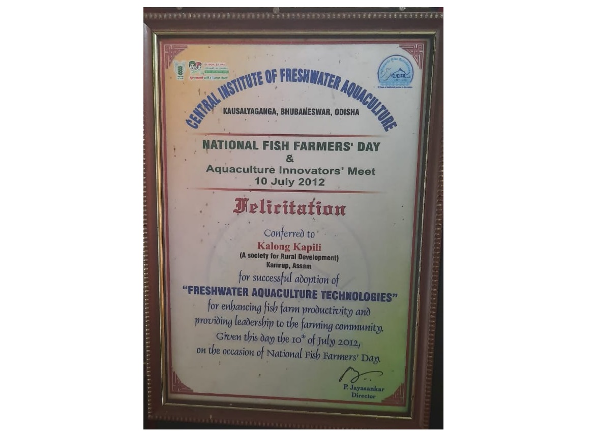 - Best NGO award received from Government of Assam; ICAR-CIFA; CAU, Imphal; NABARD and Department of Fisheries, Govt of Assam.