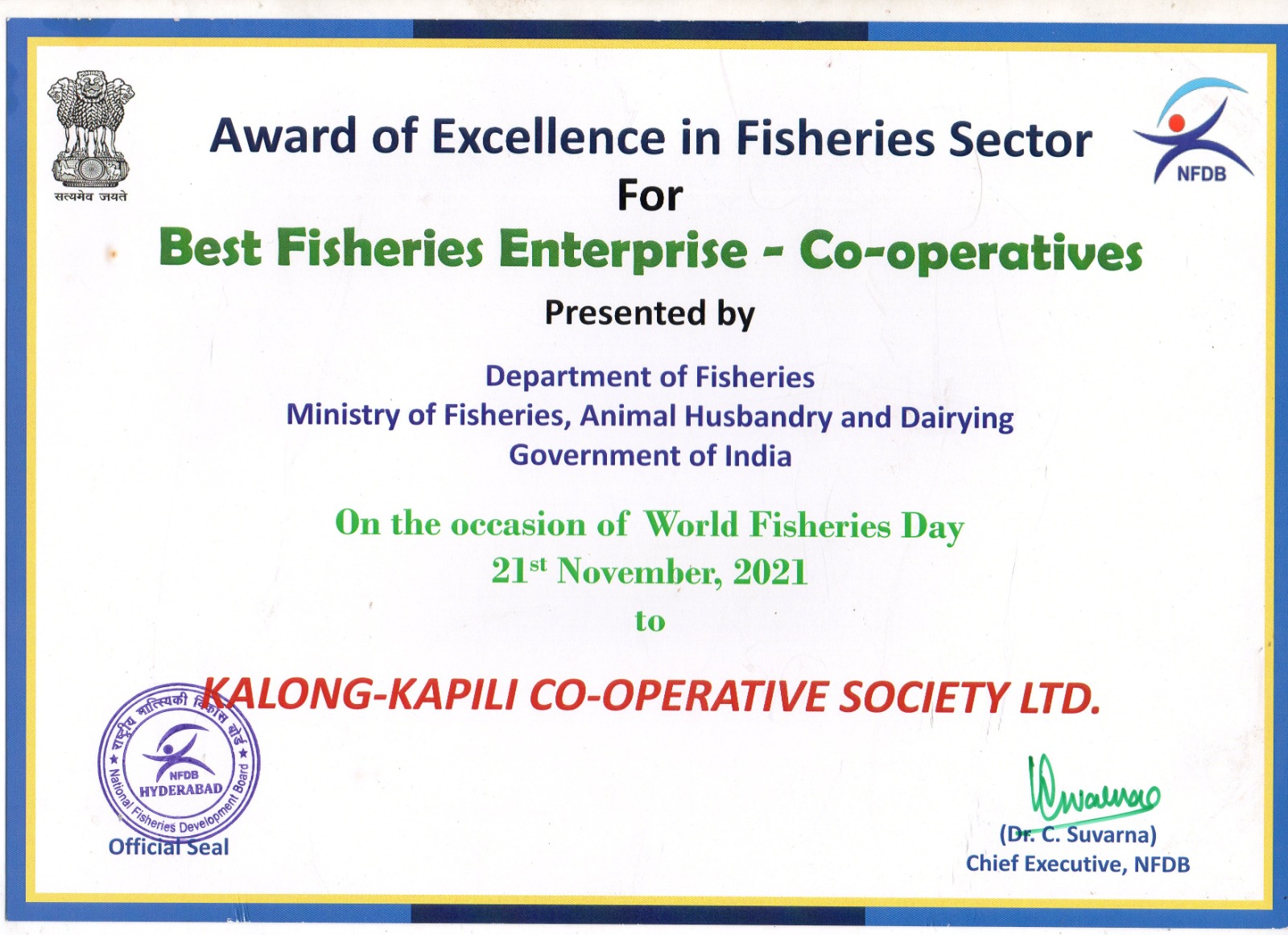 - Best Society Award of the Country from Govt. of India on 21 st November, 2021 at World Fisheries Day National Celebration.