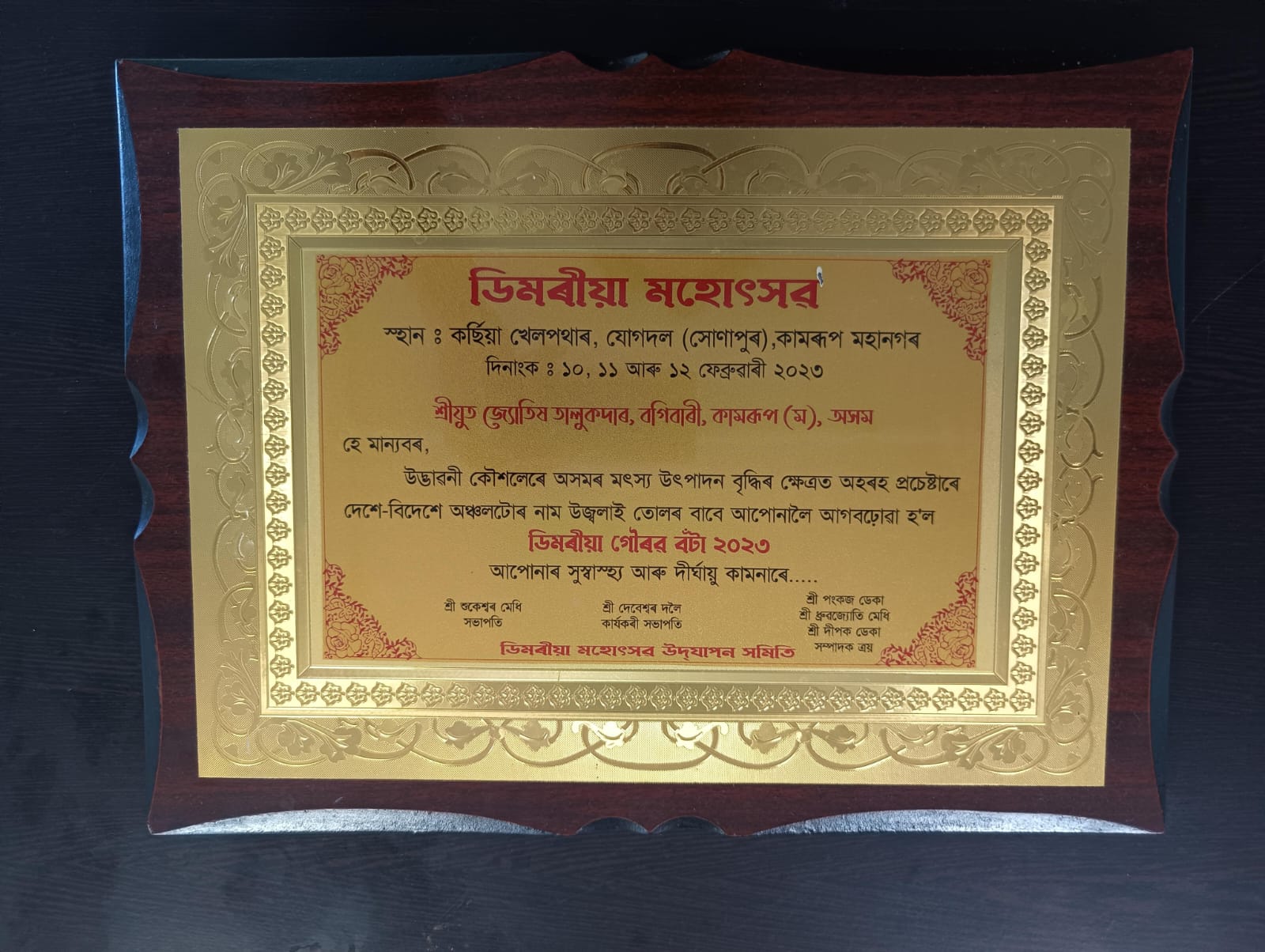 - Received best award from the Fishery Minister of Assam Parimal Suklabadya in 2019.